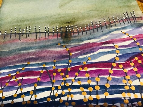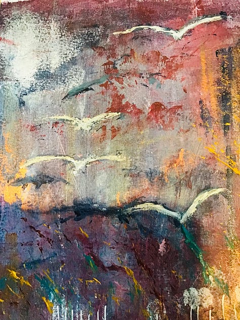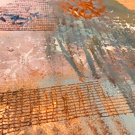My art training was orginally in textile art and painting fabric was a fundamental part of that. In more recent years, I have been known to shift to painting on paper or canvas. I would quite like a go with wooden substrates so that is on my 2026 list as well. My paintings draw on landscape but quickly become very abstract allowing me a sense of freedom that fits well in my winter sanctuary. I don’t subscribe to the belief that we all have to be good at every creative project we tackle. Sometimes it is firmly about the creative process. In fact I can often be found cutting up some paintings to use in my mixed media work. It is my time to play. Play is often educated out of us and we have to invest in it to re-find it within us.